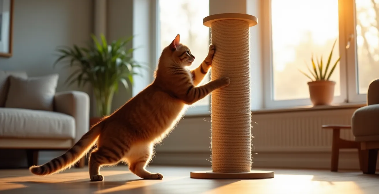 A post shorter than 30 inches (approximately 76 cm) is a catastrophic design failure for the average adult cat. It forces the cat into a compromised, bent-elbow posture, preventing full muscle and spinal extension. This is not just unsatisfying; it’s dysfunctional. A cat that cannot get a proper stretch will seek out other vertical surfaces that meet its biomechanical needs—often the arm of your sofa or a door frame. The industry standard should be a minimum height derived from the cat itself. A practical engineering rule is to measure your cat from nose to the base of its tail and ensure the post height is at least 1.5 times that length. For most cats, this results in a requirement of 30-36 inches of uninterrupted scratching surface.